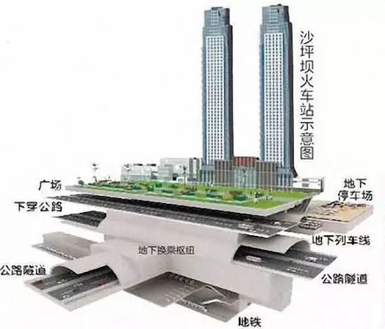 如今,沙坪坝火车站综合交通枢纽工程正在紧锣密鼓的进行,即将“涅盘重生”。地下有7层,多种交通工具零换乘,沙坪坝综合交通枢纽共7层,均设置在地下。负1层是公交站,负2层是出租车站与高铁站台,负3、负5、负6层是停车场,负4层是换乘大厅和部分停车库,负7层是轨道9号线站厅。