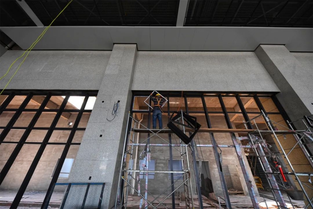 工人们正抓紧进行作业,有序推进工程装修工作,预计6月完工,