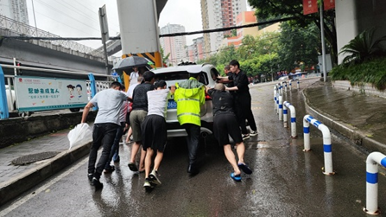 大雨来势汹汹,九龙坡交巡警闻警而动,对人流、车流较密集的路口、路段加派警力指挥交通,并及时对过往车辆进行分流和疏导,对积水路段及时配合做好清理工作,强化对主要交通干道路的巡逻管控,发现有新的积水、内涝点及时摆放警示标志,提醒过往车辆避开积水路段。