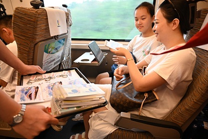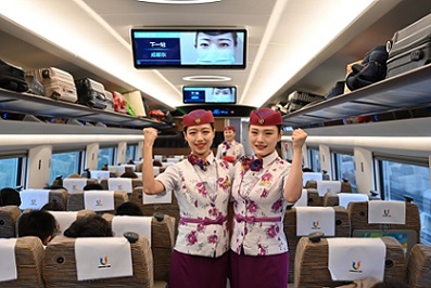 与普通高铁不同的是,这趟列车在座位、车窗和车门等地,张贴有大运会宣传画及相关图案。旅客进入车厢,就能感受到大运会氛围。当日在G8612次列车上,乘务员利用展板,向旅客介绍成渝两地的美食美景。同时通过唱歌、有奖问答等方式,让旅客了解成渝两地文化,将大运会的喜庆氛围传递给每一位旅客。